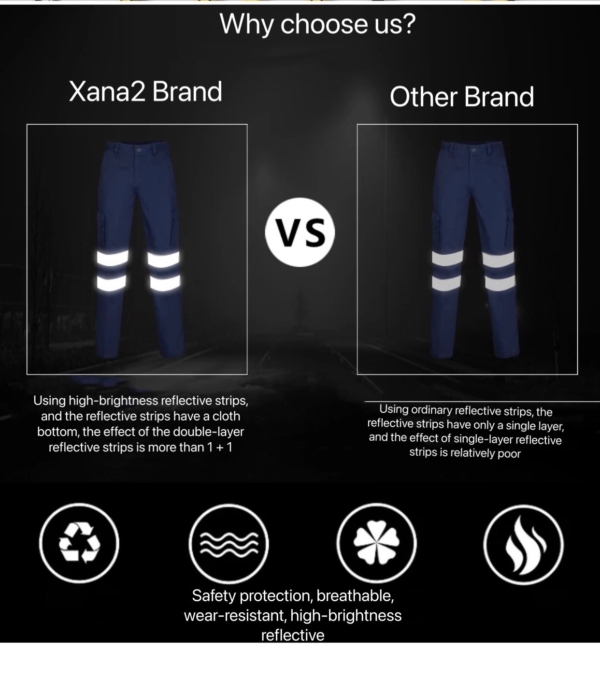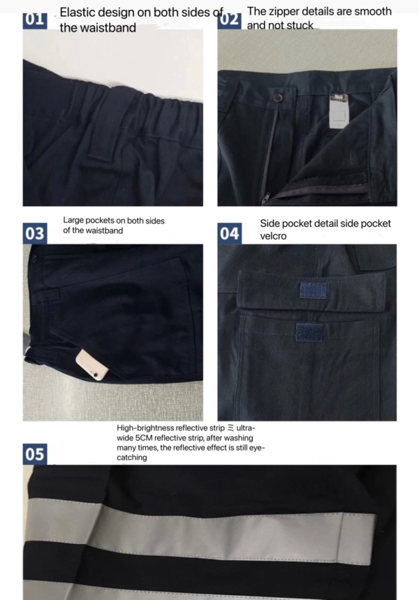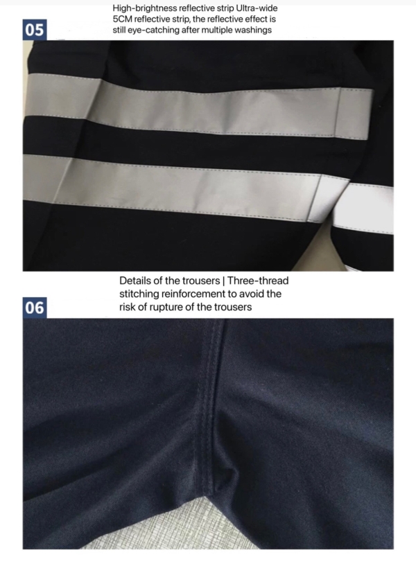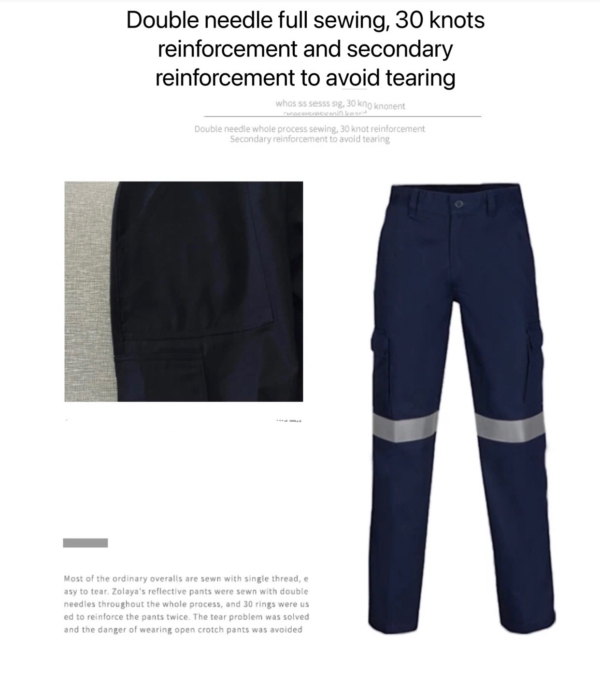 • Ordinary overalls are mostly sewn with a single thread, which is easy to tear. Zoraya reflective trousers are sewn with two needles throughout the whole process. The trousers are reinforced with 30 knots twice, which solves the problem of tearing and avoids the danger of wearing open crotch trousers.