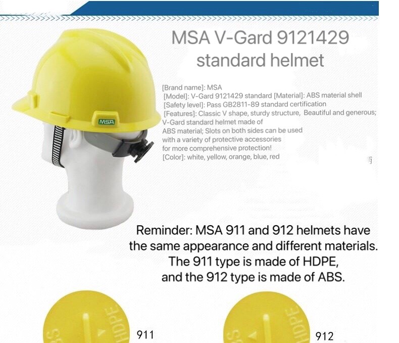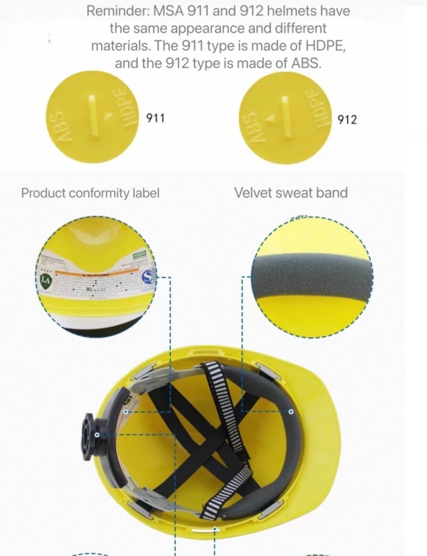 Reminder: MSA 911 and 912 helmets have the same appearance and different materials. The 911 type is made of HDPE, and the 912 type is made of ABS.